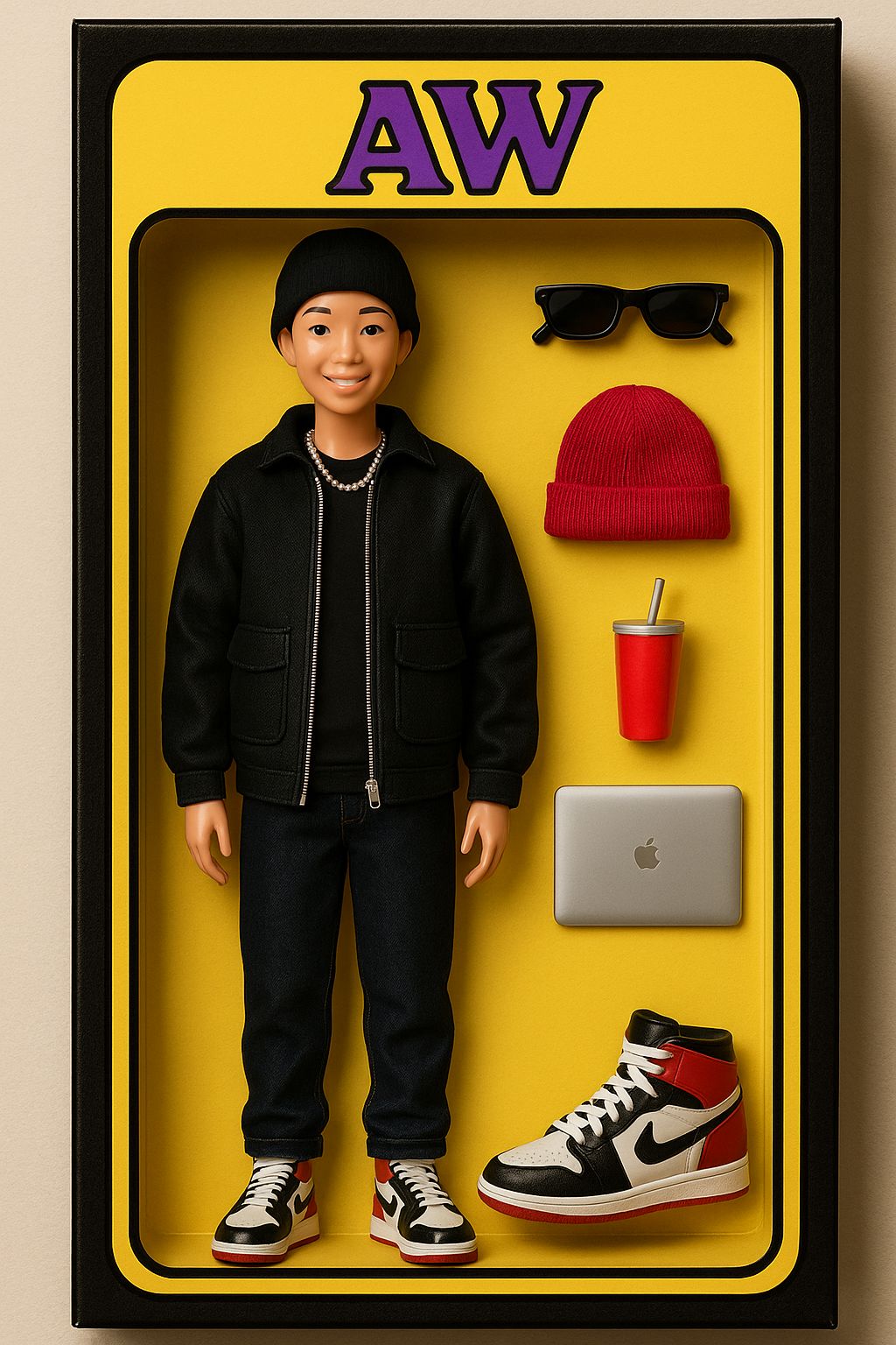 Create a realistic action figure (Barbie doll) of the person in this photo. The doll should be full figure and displayed in its original clear plastic box packaging. At the top of the box is the name of the toy: "[your preferred name]". In the packaging, next to the figure, include accessories like [your preferred items — e.g., laptop, pink coffee cup, sunglasses].