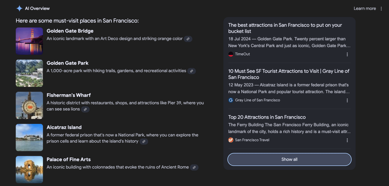 Listen, Google’s quick about it—boom, here’s your Golden Gate Bridge, Alcatraz, and Fisherman’s Wharf, complete with pretty pictures.