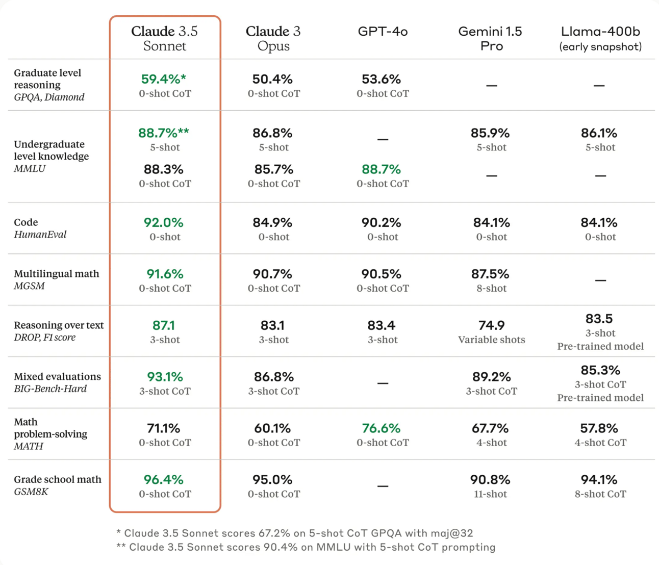 Explanation: This measures the AI's ability to understand and process complex, nuanced topics typically encountered at a graduate level, including advanced logic and problem-solving skills. Claude 3.5 Sonnet's higher score means it can handle more intricate and detailed queries.